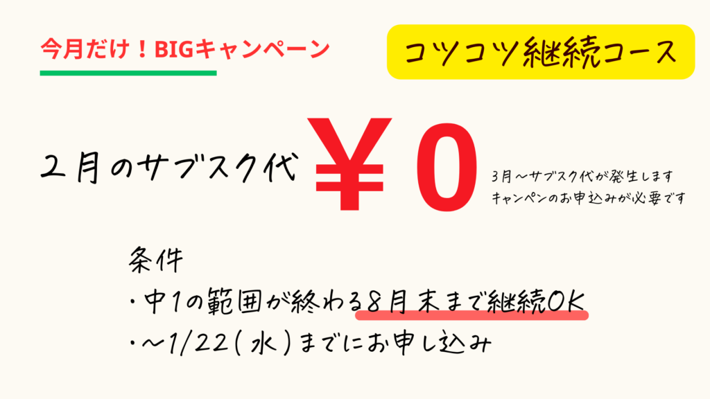 中1が終わる8月まで「継続OK」であれば、2月分のサブスク代は「無料」です