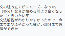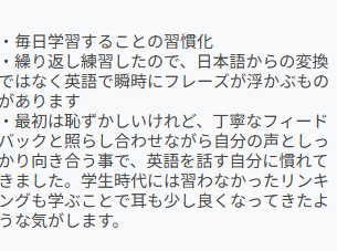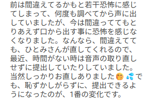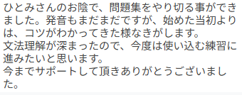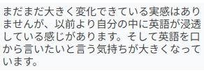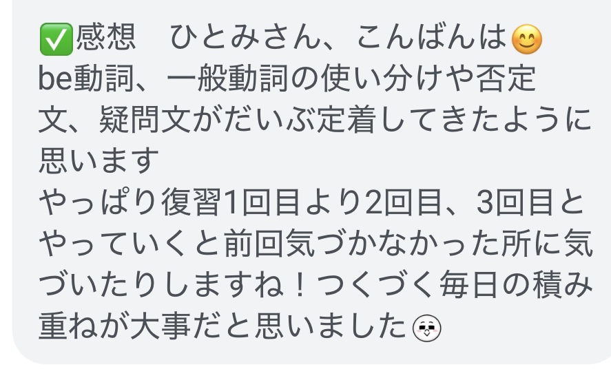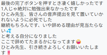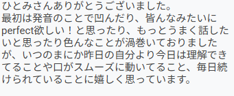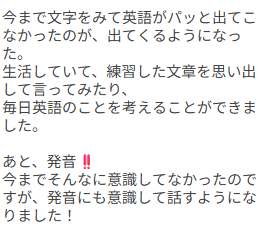 いままで、瞬間英作文、自分でやってみたけど、できなかった。このコースでHitomiさんとだから続いてる!って嬉しいコメントたくさんもらったよ