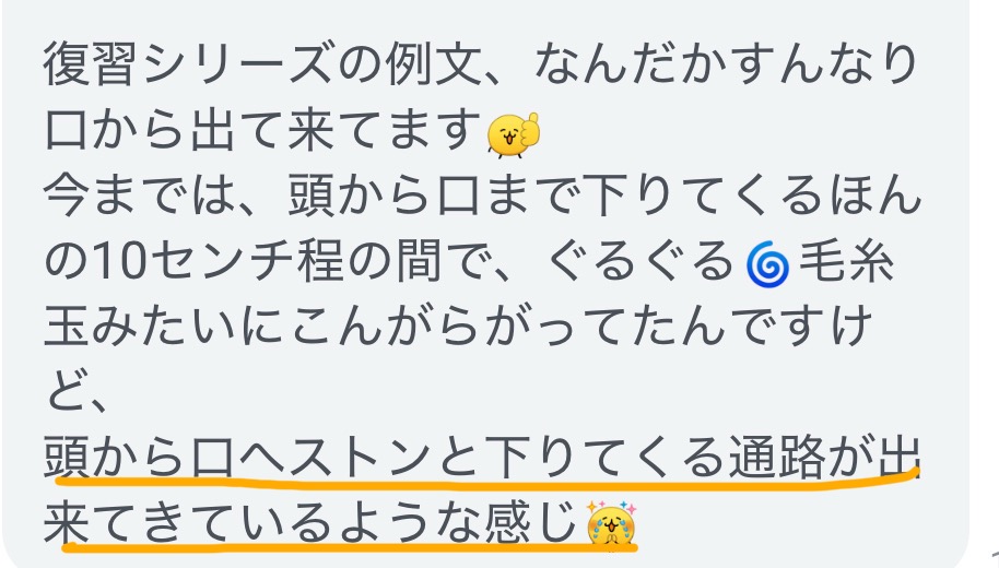 英語初心者さんは「知ってる」と「話せる」のギャップに気付きにくい。だから「知ってるのに話せない」と落ち込む。でも、実際は「わかった」状態からが勝負。10回…100回…身体になじませる作業が必要なんです。これが地道な作業…💦
