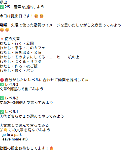 ※動画は自分を映してくれなくてOK,壁でも、ペットでも風景でもOKです。音声提出より動画のほうがチェックしやすいので、動画で提出お願いしてます